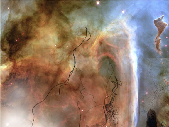 A fusion of images from the Hubble Space telescope showing distant nebulae. Our place in the universe. The space images are overlaid with a pencil drawing.