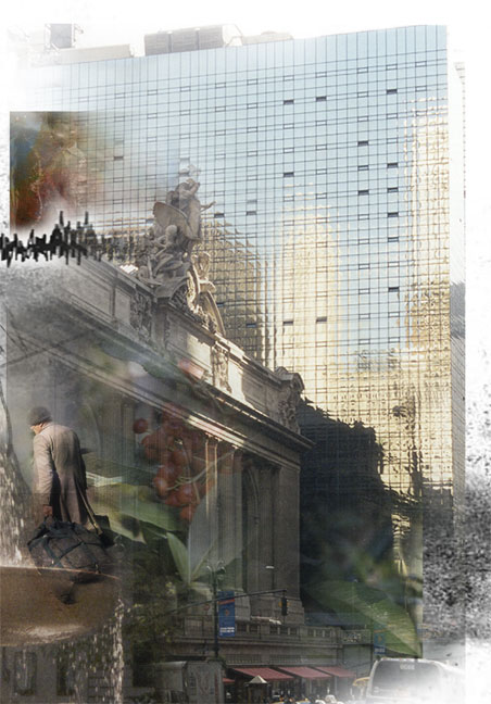 Some of the architecture of New York City -- Grand Central Station, a nearby hotel building. In the far upper left corner, faintly, a young boy. Overlaying the picture of Grand Central, vegetation, berries, and a traveler.