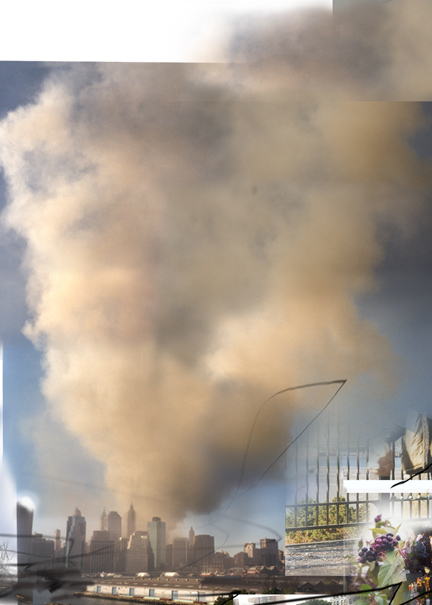 Smoke billowing up from lower Manhattan. The enormous column of smoke dwarfing the skyscrapers disrupts our sense of scale and conveys the scale, and horror, of the devastation. At the same time that it is so horrific, the image is also, if we forget for a moment what it represents, quite beautiful. Shiva. Occasional sheets of paper float through air and smoke. This image was shot the afternoon of the attack.
