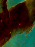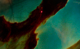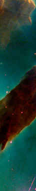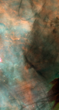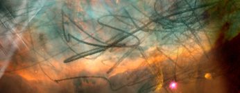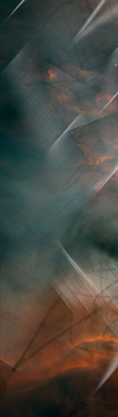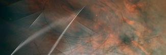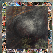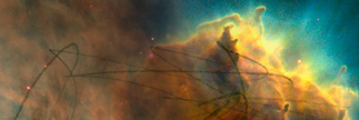 A cluster of nebulae in outer space, photographed by the Hubble Space Telescope. Overlaying that, hand-drawn marks moving through space, and a large drawing of a sphere floating in a dark space. At times, the edges of the sphere cannot be distinguished against the space around it. Around this drawing, a frame consisting of numerous small photogaphs of our daily lives.