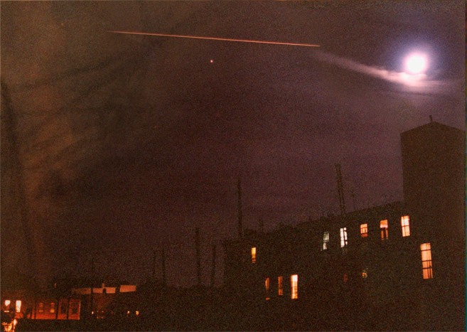 A photograph of a cityscape at night -- moon, clouds, streak of an airplane, and the small red dot in the sky is Mars.