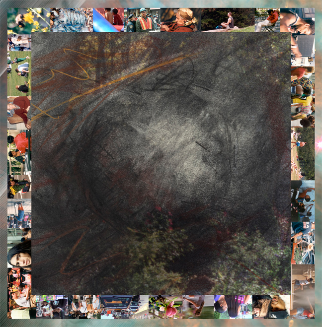 A charcoal drawing, merging with photographs of trees and flowers. Around all, a frame composed of numerous small photographs.