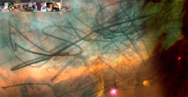 The Hubble Space Telescope imagery of distant nebulae is overlaid with hand-drawn drawings, originally done in pencil.