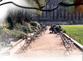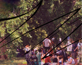People at work and at play in the city. Nebulae in outer space. An image of a Bodhisattva. A walkway leading into the picture plane and space.