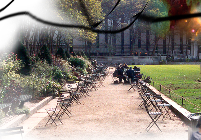 A walkway in a park. While the rest of the composition is very flat, this image, with its pronounced perspective, leads the viewer straight into the space.