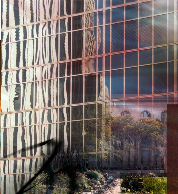 The windows of a skyscraper, reflecting and distorting sky and other nearby buildings.