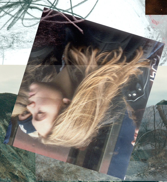 An image of a young girl with swirling blond hair. The lines of her hair echo those of the trees in the photographs below, as well as those of the hand-drawn lines that connect the compositions elements. The image of the girl is upside down and tilted, allowing us to see the forms and colors more easily, without reference to what they represent.