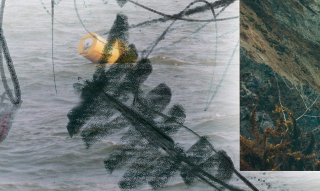 In the center of the composition, an endless green-gray sea. A bright yellow buoy floating in the swells. Over all, hand-drawn lines that echo the forms in the photographs and connect the various elements