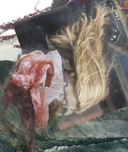 A young girl's swirling blond hair. A spent Iris bloom, overlaid by a network of thin white drawing. The lines of both swirl up and around and continue the circular motion of the overall composition.