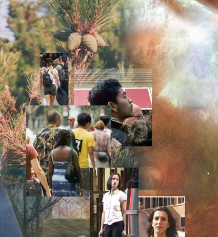 A mix of people, looking, going about their business. The colors of the people and their clothing echo the colors of the adjacent pine tree and nebula.