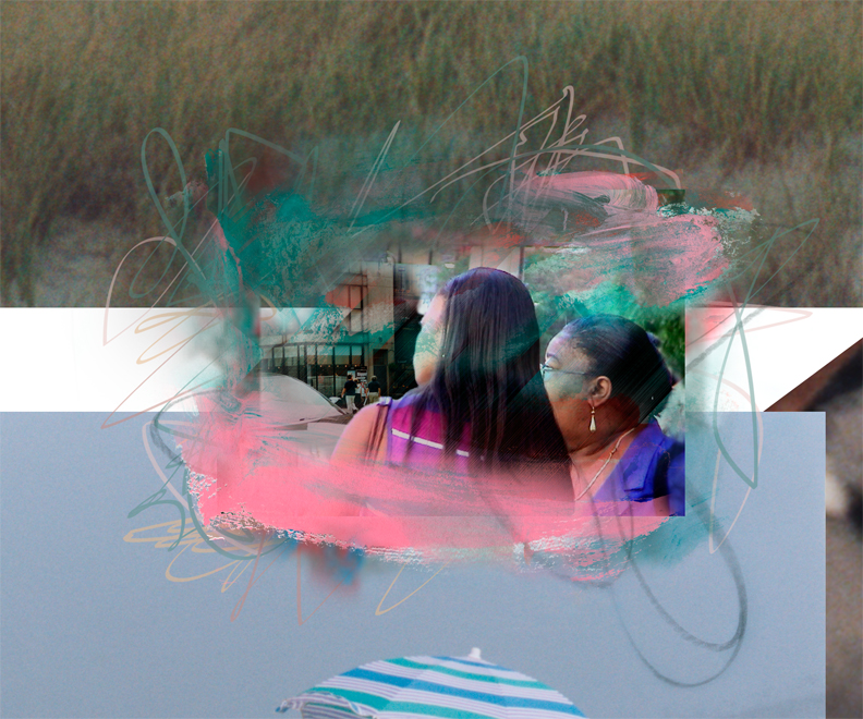 A painterly mix of brush strokes and lines, over and under a photograph of two people on a city street. (In the mural version of this composition, the area of the photograph is live, processed video.)